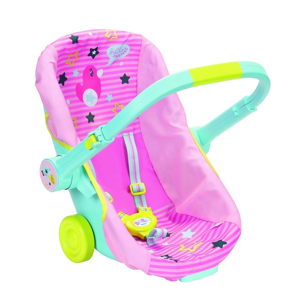 Najnowsze rozwiązanie nosidełka 3w1 do przemieszczania się z lalką Baby Born. Można je wykorzystać jako tradycyjne nosidełko aby przenosić lalkę z miejsca na miejsce za uchwyt. Funkcja numer dwa jest funkcją siedzącą: nosidełko w pozycji pionowej działa jak fotelik samochodowy który zapewnia BABY born(R) dobry widok na otoczenie. I teraz najważniejsza funkcja numer trzy: Koła umieszczone w urządzeniu pozwalają na ciągnięcie BABY born(R) tak samo jak w wózku. Dzięki umieszczonym pasom bezpieczeństwa, maluch zawsze jest bezpieczny podczas swoich podróży i najwyraźniej dobrze się bawi. Wysuwany uchwyt pozwala na wygodne ciągnięcie lub pchanie wózka.
