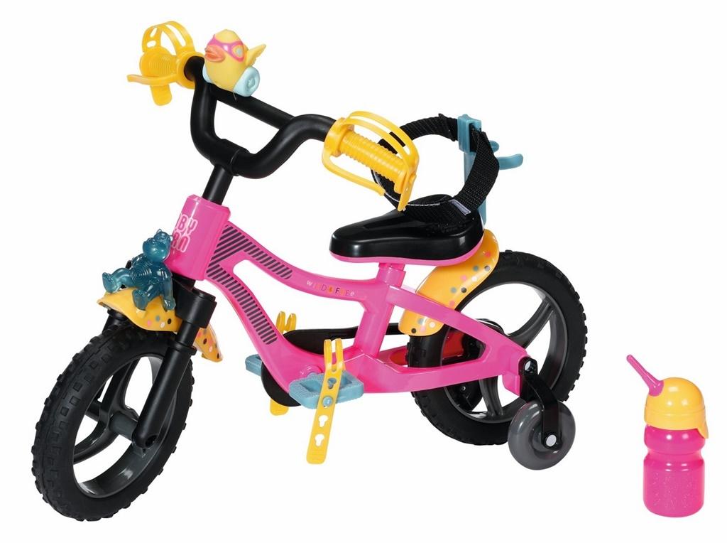 Żółte błotniki w kolorowe kropki chronią różowy rowerek przed rozbryzganym błotem. Kaczuszkowy klakson i światło z niedźwiadkowego reflektora sprawiają, że BABY born, gdzie by nie pojechała, nie pozostanie niezauważona. Zwłaszcza, gdy popisuje sięsztuczkamiwykonując stylowe wyskoki. Żółte paski na rękach i stopach oraz system mocowaństanowią o bezpieczeństwie maluszka w siodełku, podczas gdy stabilizatory pomagają w utrzymaniu równowagi. Gdyby zachciało jej się pić, zawsze może sięgnąć po dopasowaną do roweru butelkę.