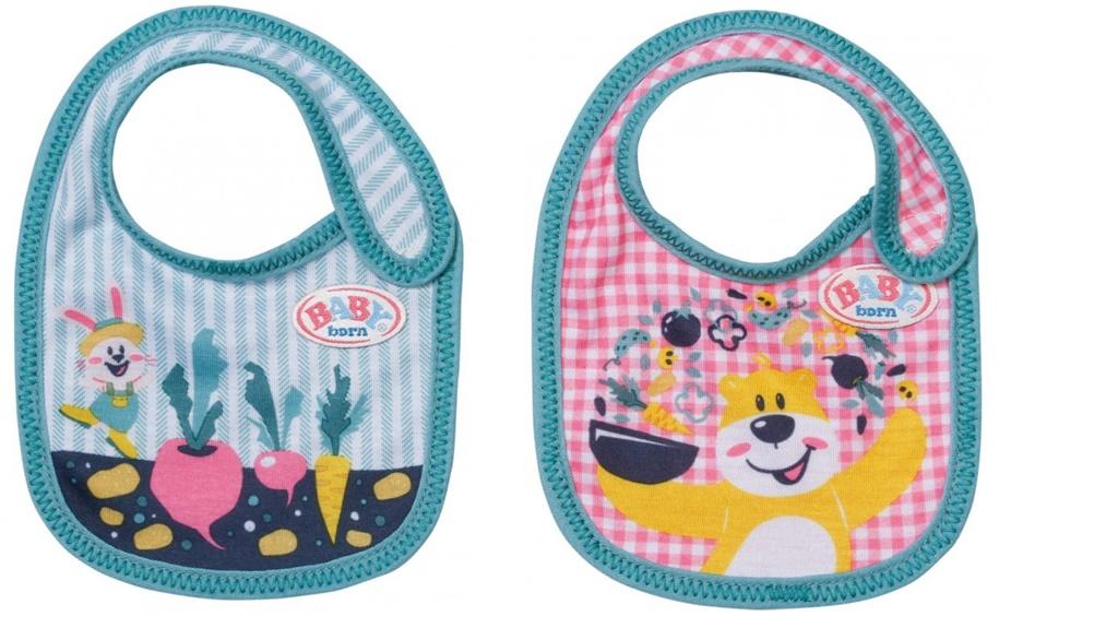 No to mamy dylemacik. BABY born ma dwa śliniaki i nie wie, który dziś założyć. Na śliniaczku w zielone pasy króliczek Benno kica pomiędzy marchewkami i buraczkami. Na kraciastym różowym śliniaczku widać szefa kuchni niedźwiadka Bruno jak przyrządza zupę warzywną. Oby BABY born szybciej zastanawiała się nad jedzeniem...