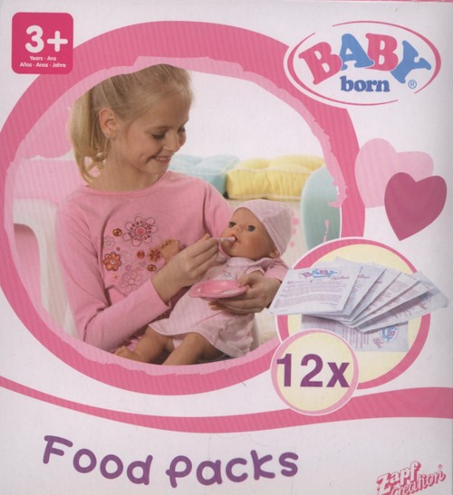 12 opakowań kleiku dla lalek z serii baby born z funkcją jedzenia. Produkt nie przeznaczony do spożycia, ale nieszkodliwy w przypadku połknięcia przez dziecko. Zabawka dla dzieci w wieku od 3 lat.