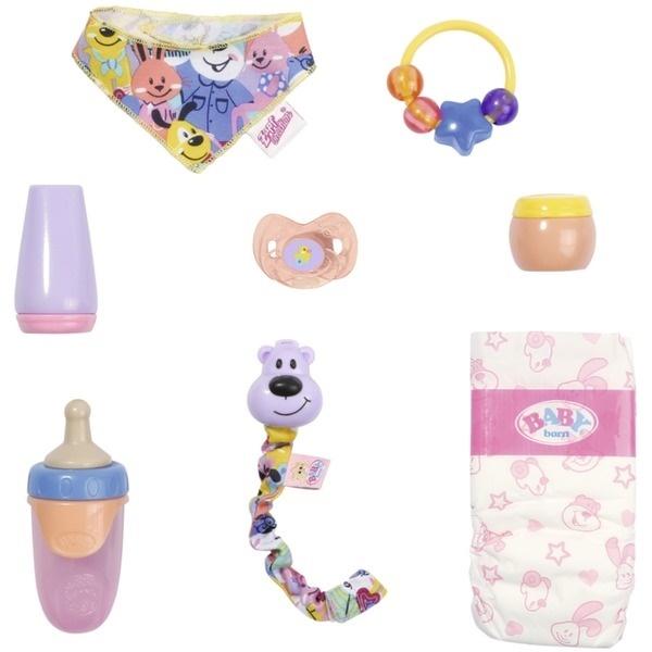 Zestaw startowy akcesoriów BABY born Starter Set z magicznym smoczkiem na łańcuszku, pieluszką, zabawką-gryzakiem, pojemnikiem na puder, kremem w tubce, butelką do karmienia i apaszką.