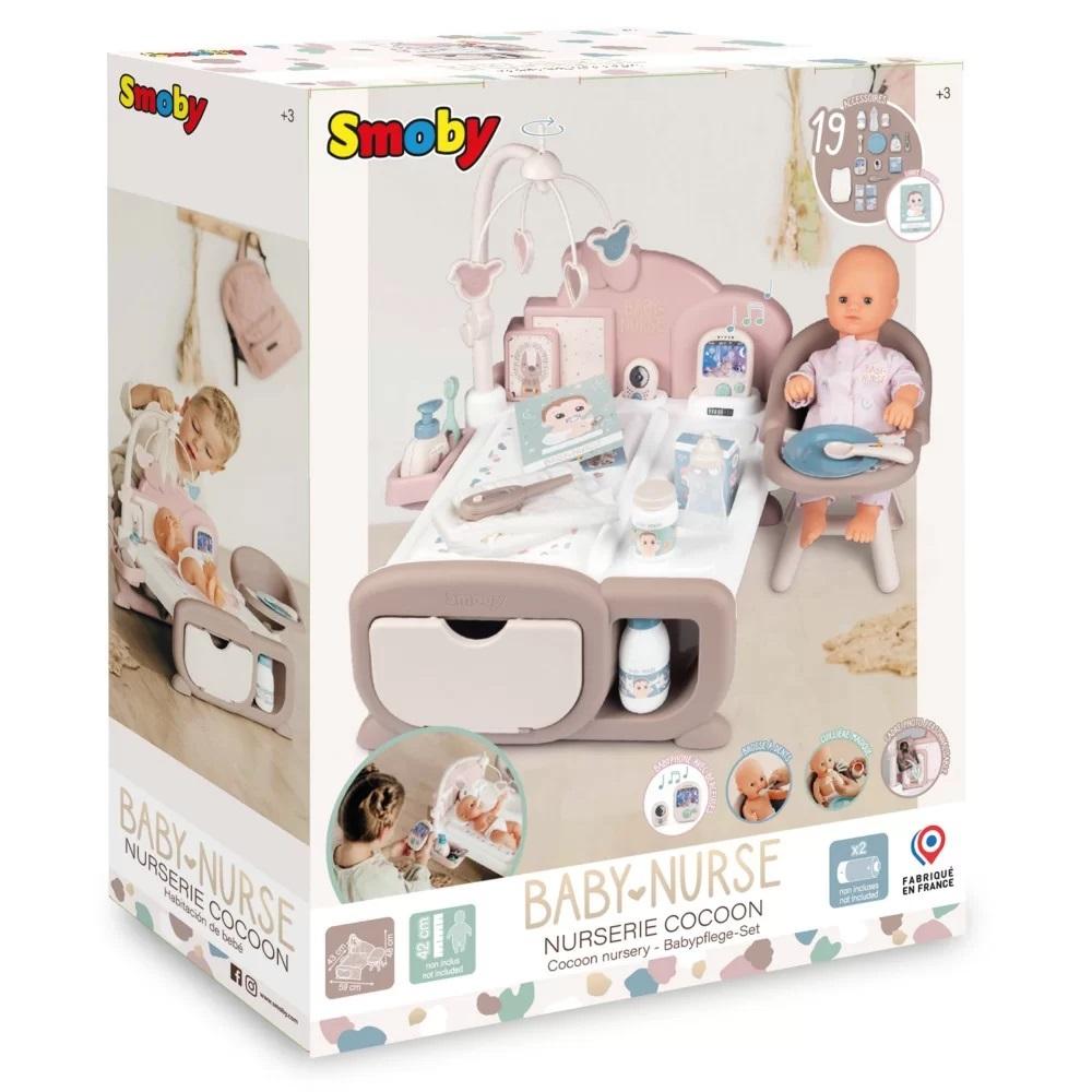 Elektroniczny kącik opiekunki z 20 akcesoriami. Zestaw składa się z trzech różnych obszarów: kuchni z krzesełkiem, strefy pielęgnacji lalki oraz sypialni z karuzelką. W zestawie atrapa kamery i elektronicznej niani z dźwiękiem dla zwiększenia realizmu opieki nad lalką. Zestaw dla lalki do 42 cm (brak lalki w zestawie). Wyprodukowany we Francji. Wymiary: 59 x 43 x 48 cm, 3 l+