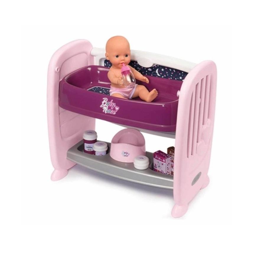 Łóżeczko do spania, które może zmienić się w stolik do przewijania bobasów! 3 pozycje wysokości łóżeczka, aby łatwo dopasować do wysokości łóżka dziecka, składany blat przewijaka, 14 akcesoriów, w tym lalka 30 cm, nocniczek, butelka, plastikowe pojemniczki. Do zabawy lalkami do 42 cm.