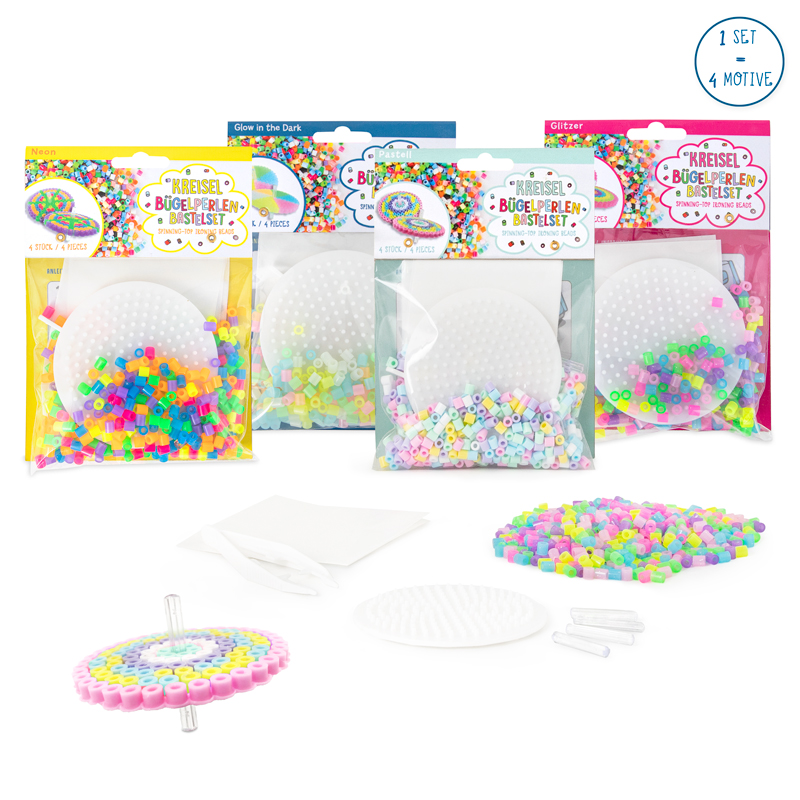 Klasyka w nowej odsłonie! Stwórz swój własny bączek z tym kolorowym zestawem koralików do prasowania. Wystarczy stworzyć obrazek z koralików do prasowania, a po wyprasowaniu włożyć patyczek do bączka przez otwór w środku. W każdym zestawie są cztery różne wzory do kolorowej zabawy z bączkiem. Zawartość każdego zestawu: 1x płytka z kołkami (ok. O 8,8 cm), 550 koralików do prasowania, 1x pęseta, 1x papier do prasowania, 4x patyczki do bączków. Dostępne w 4 różnych wzorach: Glow in the Dark, Neon, Pastel, Glitter