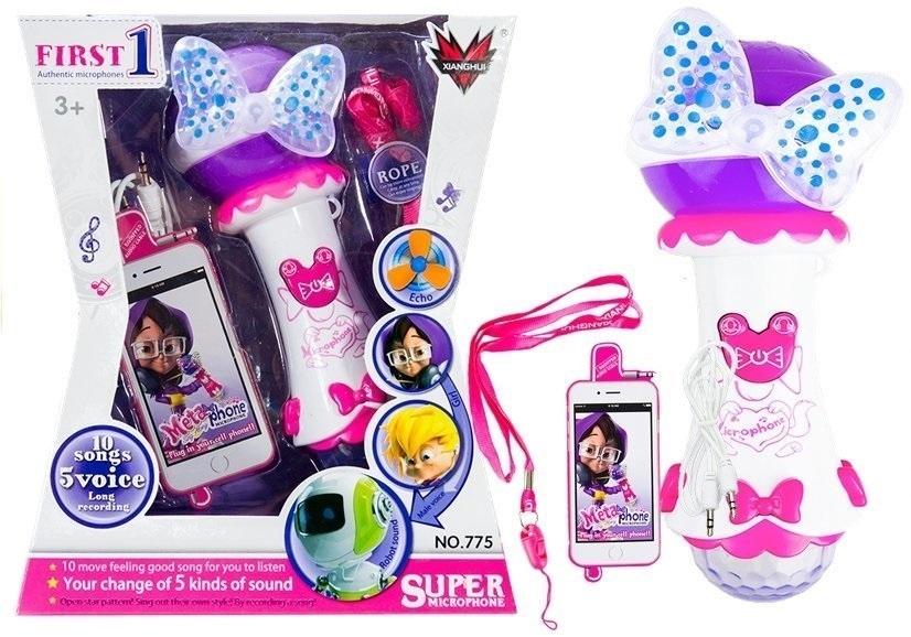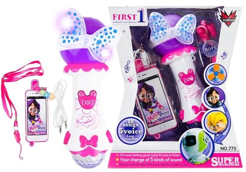 Mikrofon to świetna propozycja dla małych dam, których marzeniem jest zostanie piosenkarką. Śpiewanie z mikrofonem karaoke to świetna zabawa. Mikrofon posiada funkcję nagrywania, i odtwarzania, posiada również wejście na MP3 co pozwoli na śpiewanie ulubionych piosenek do oryginalnego podkładu. Ciekawa funkcja mikrofonu jest zmiana głosu dziecka na pięć innych. Dodatkowym atutem są swiecąca kokardka oraz kula na dole mikrofonu. Zabawka wyposażona jest w: - 10 najpopularniejszych piosenek - 5 różnych dźwięku - możliwość nagrywania i odtwarzania - podpięcie MP3 Zestaw zawiera: Mikrofon, kabel do mp3 oraz smycz Wielkośc mikrofnomu to ok 19cm