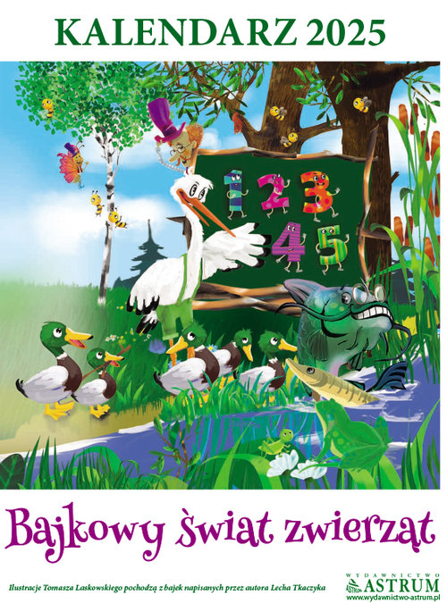 Kalendarz Bajkowy świat zwierząt. Zawiera ilustracje z bajek napisanych przez Lecha Tkaczyka.