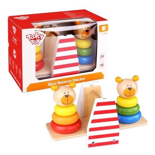 Balansujące Misie to zabawka inspirująca dzieci na wielu poziomach. Dwie piramidki Misie balansują na wadze. Każda z piramidek ma po 3 różnokolorowe krążki. Nakładanie lub zdejmowanie krążków po dwóch stronach wagi pozwoli zrozumieć dziecku zależność między wagą a równowagą. Zabawa rozwija koordynację manualną i logiczne myślenie. Uczy rozróżniania kolorów, pojęcia wyżej – niżej. Zabawki Tooky Toy są bezpieczne. Posiadają certyfikaty ekologicznych produktów. Pozbawione ostrych krawędzi, dobrze wygładzone, pomalowane są nietoksycznymi farbami i lakierami. Wiek: 24 m+