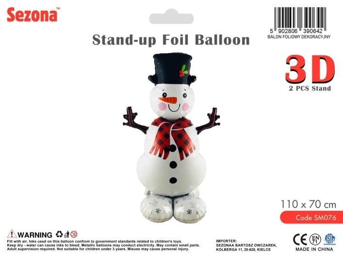 Dekoracyjny balon foliowy 3D w formie stojącej przedstawiający świątecznego bałwana w kapeluszu i szaliku. Idealny na Boże Narodzenie, zimowe eventy, przyjęcia świąteczne oraz dekoracje witryn sklepowych. Przeznaczony do napełniania powietrzem, stabilnie stoi jako samodzielna ozdoba.