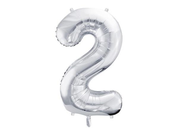 Balon foliowy metalizowany Cyfra ''2'' w kolorze srebrnym, rozmiar przed napompowaniem ok. 100 cm (39''), rozmiar po napompowaniu ok. 86 cm (34''). Do napomowania powietrzem i helem.