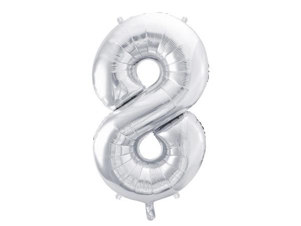 Balon foliowy metalizowany Cyfra ''8'' w kolorze srebrnym, rozmiar przed napompowaniem ok. 100 cm (39''), rozmiar po napompowaniu ok. 86 cm (34''). Do napomowania powietrzem i helem.