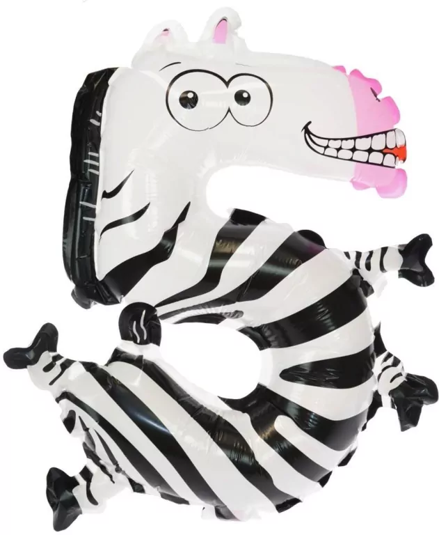 Balon foliowy w kształcie cyfry 5, stylizowany na zebrę. Balon urodzinowy dla dzieci. W połączeniu z innymi balonami z serii tworzy oryginalną dekorację przyjęcia urodzinowego, rocznicowego. Produkt należy napełnić powietrzem. Balon posiada samozaciskający się wentyl - nie trzeba go dodatkowo wiązać. Balon o wymiarze 45 cm przed napompowaniem oraz 36 cm po nadmuchaniu