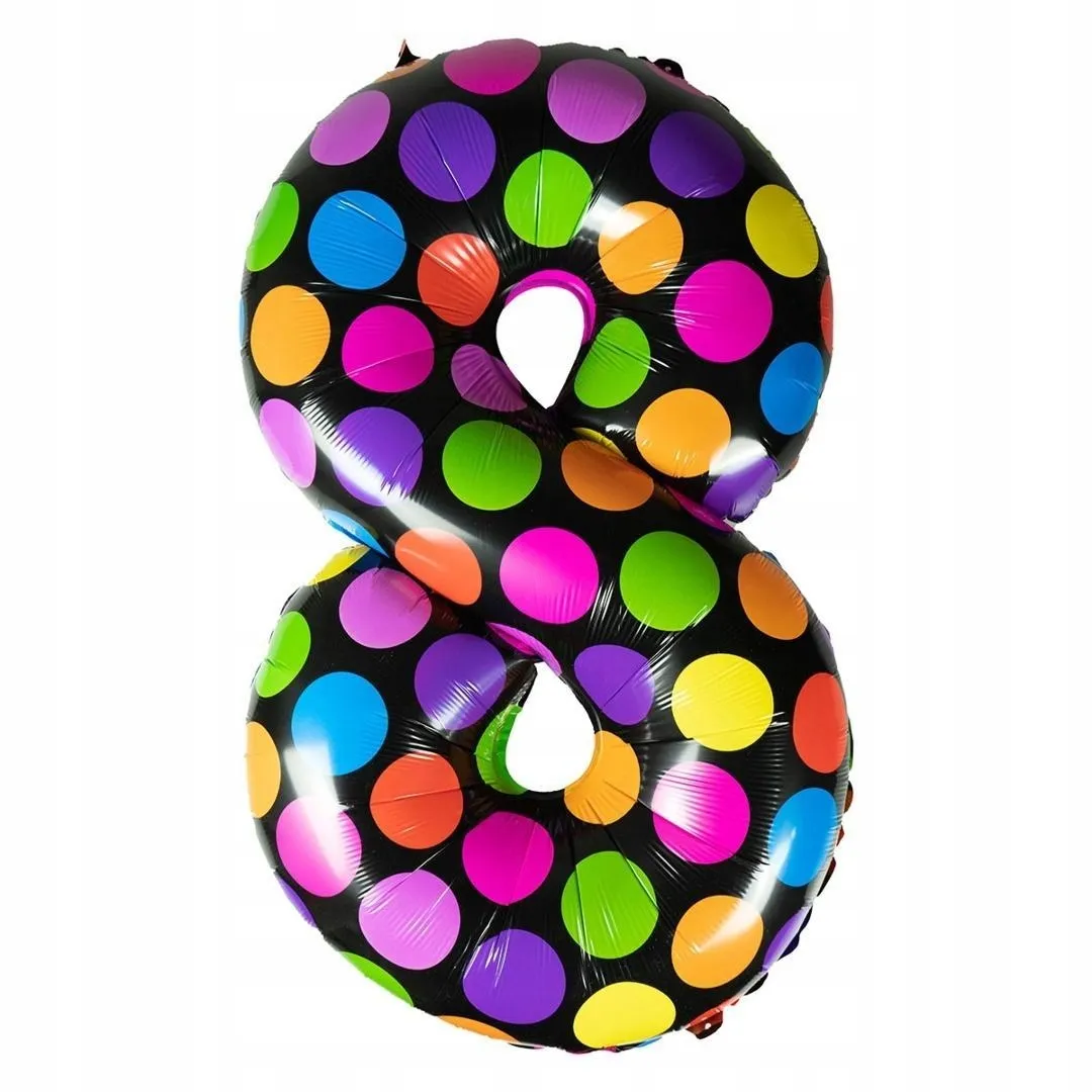 Balon foliowy w kształcie cyfry 8. Balon w kolorze czarnym w kolorowe kropeczki. Element dekoracyjny imprez urodzinowych, noworocznych i tematycznych. Balon można napełniać powietrzem lub helem. Balon posiada samozaciskający się wentyl - nie trzeba go dodatkowo wiązać. Duża cyfra o wysokości 61 cm po napompowaniu.