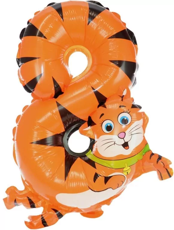 Balon foliowy w kształcie cyfry 8, stylizowany na tygryska. Balon urodzinowy dla dzieci. W połączeniu z innymi balonami z serii tworzy oryginalną dekorację przyjęcia urodzinowego, rocznicowego. Produkt należy napełnić powietrzem. Balon posiada samozaciskający się wentyl - nie trzeba go dodatkowo wiązać. Balon o wymiarze 45 cm przed napompowaniem oraz 36 cm po nadmuchaniu.