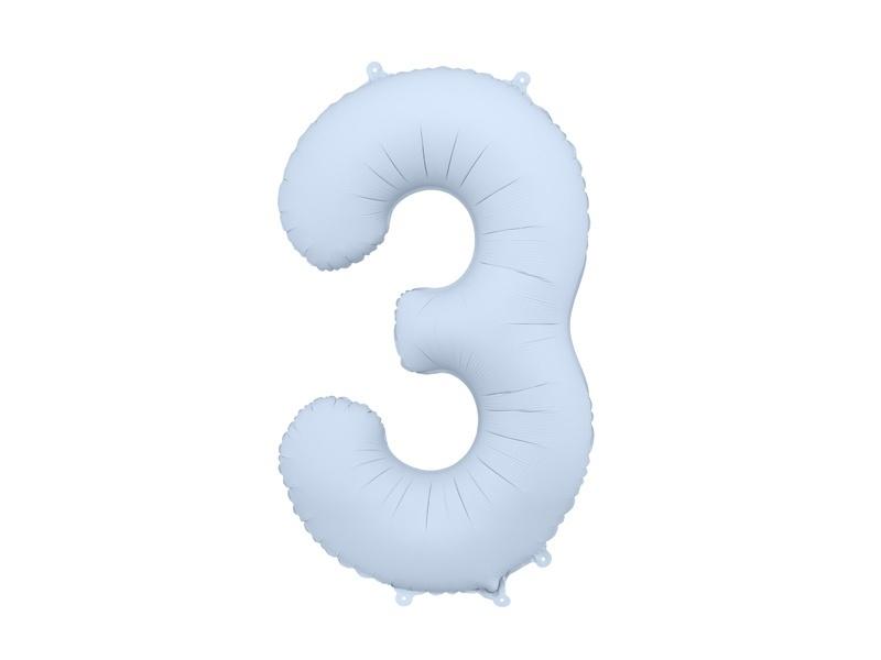 Balon foliowy matowy Cyfra 3 w kolorze mglistym niebieskim, rozmiar przed napompowaniem ok. 100 cm (39''), rozmiar po napompowaniu ok. 86 cm (34''). Do napompowania powietrzem i helem. Zestaw zawiera słomkę. Balon jest samouszczelniający się. Posiada haczyki ułatwiające montaż balona do dekoracji.
