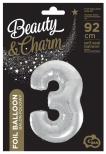 Balon foliowy Cyfra 3, srebrna, Beauty&Charm, 92 cm Wymiar balonów po napompowaniu: ok. 92 cm. Kolor: srebrny. Balony są przeznaczone do napełnienia helem. Napełnienie ich powietrzem spowoduje, że balony nie będą się unosić. Opakowanie zawiera 1 szt. Producent: GoDan S.A. Balony nie są napełnione helem.
