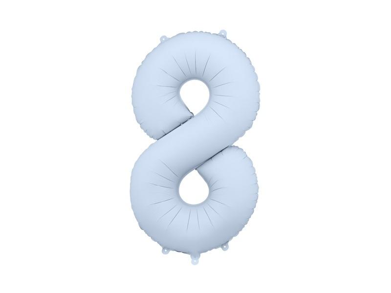 Balon foliowy matowy Cyfra 8 w kolorze mglistym niebieskim, rozmiar przed napompowaniem ok. 100 cm (39''), rozmiar po napompowaniu ok. 86 cm (34''). Do napompowania powietrzem i helem. Zestaw zawiera słomkę. Balon jest samouszczelniający się. Posiada haczyki ułatwiające montaż balona do dekoracji.