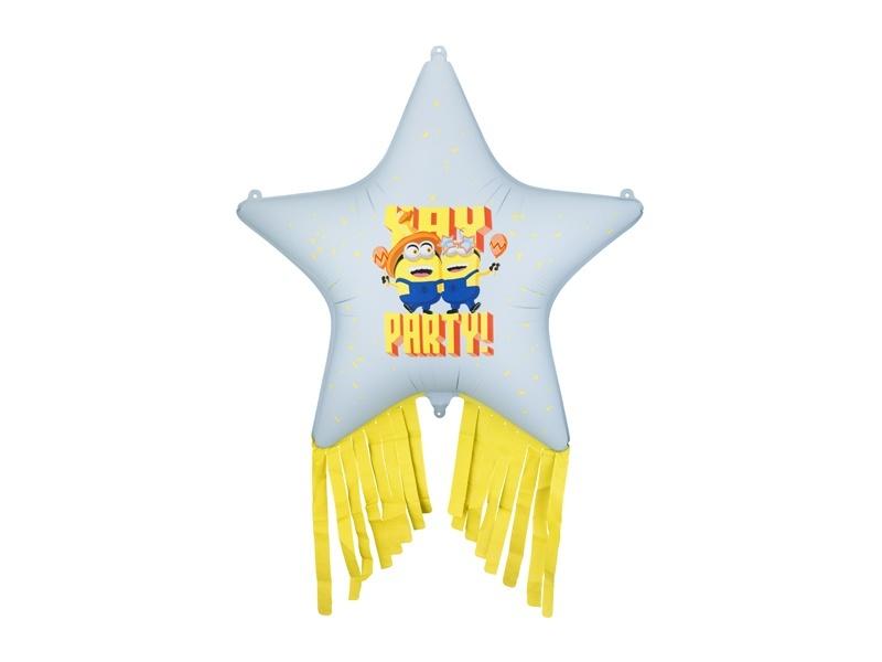 Balon foliowy Gwiazda z frędzlami Minionki, mix kolorów. Wymiary przed napompowaniem: ok. 79.5 x 76.5 cm (31.3 x 30.1''), wymiary po napompowaniu: ok. 72 x 72 cm (28.3 x 28.3''). Do napompowania powietrzem i helem. Zestaw zawiera słomkę.