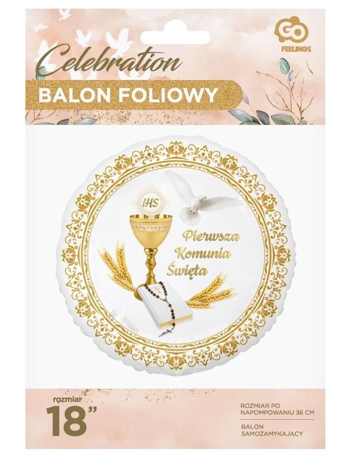 Balon foliowy Pierwsza Komunia Święta, 45 cm Rozmiar: 45 cm (18") Kształt: Okrągły Kolor: Biało-złoty Nadruk: Pierwsza komunia święta Kolekcja: Celebration Ilość sztuk w opakowaniu: 1 Producent: Godan S.A. Balony są przeznaczone do napełnienia helem. Napełnienie ich powietrzem spowoduje, że balony nie będą się unosić. Balony nie są napełnione helem ani powietrzem. Należy je napełnić samodzielnie. Balon wyposażony w samo zamykający zawór Dekoracyjny balon foliowy na Pierwszą Komunię. Piękny biało-złoty nadruk z motywami religijnymi podkreśli podniosły charakter uroczystości. Idealny jako prezent komunijny. Balon wykonaliśmy z mocnej folii., dzięki czemu jest bardzo wytrzymały. Łatwo go napełnisz helem lub powietrzem a samozamykający system uniemożliwi ucieczkę helu po napełnieniu. Zastanawiasz się jak napompować balony helem? To bardzo proste. Nasze balony foliowe bez trudu napełnisz helem w domu Będziesz potrzebować podręcznej butli z helem - znajdziesz je w naszym sklepie. Przydadzą Ci się również ciężarki do balonów i wstążki do balonów, które również posiadamy w asortymencie w wielu kolorach, kształtach i rozmiarach. Dzięki nim będziesz mieć pewność, że balony nie uciekną przez okno. ;) Nie masz helu? Nic straconego! Weź rurkę (słomkę), włóż ją do otworu napełniania i nadmuchaj balon foliowy powietrzem. Pamiętaj, że balon foliowy napełniony powietrzem nie będzie się unosił.