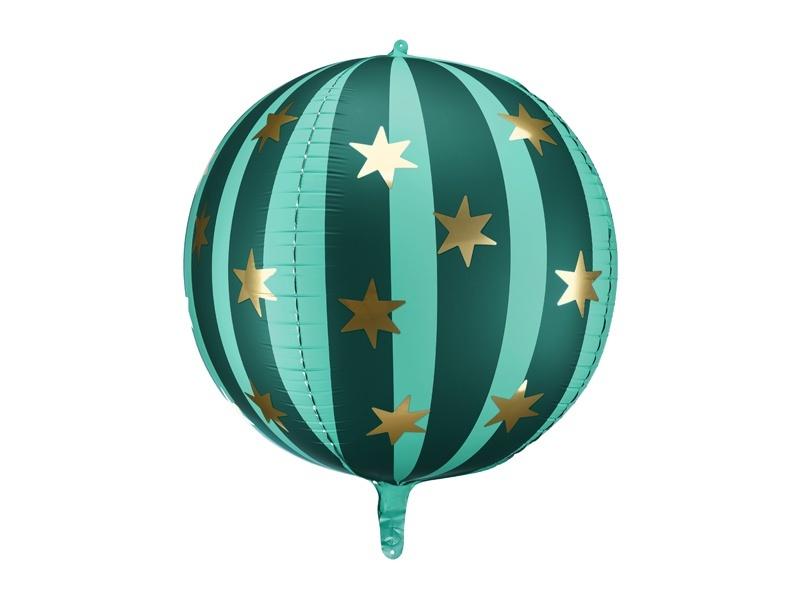 Balon foliowy Piłka w kolorze zielonym matowym w złote gwiazdki, średnica przed napompowaniem ok. 75 cm, średnica po napompowaniu ok. 50 cm. Zestaw zawiera słomkę.