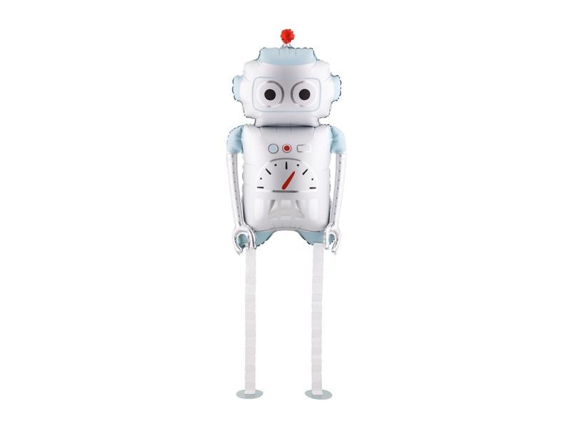 Chodzący balon foliowy Robot, w kolorze srebrno-jasnoniebieskim. Wymiary przed napompowaniem ok. 78 x 97 cm (30.7 x 38.2''), wymiary po napompowaniu ok. 37 x 80 cm (14.6 x 31.5''). Wysokość nóżek około 45 cm. Do napompowania helem. Zestaw zawiera słomkę.