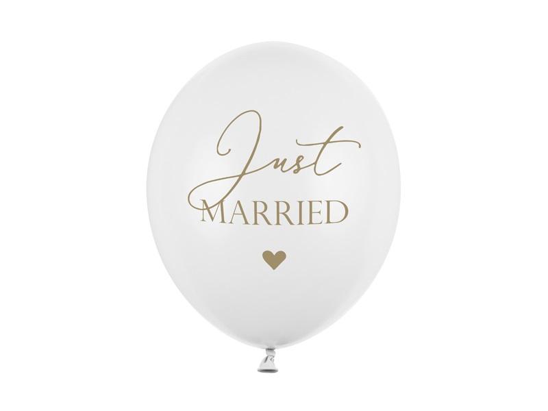 Balony Strong, Pastel Pure White ze złotym dwustronnym nadrukiem Just Married, średnica 30 cm(1 op. / 50 szt.)