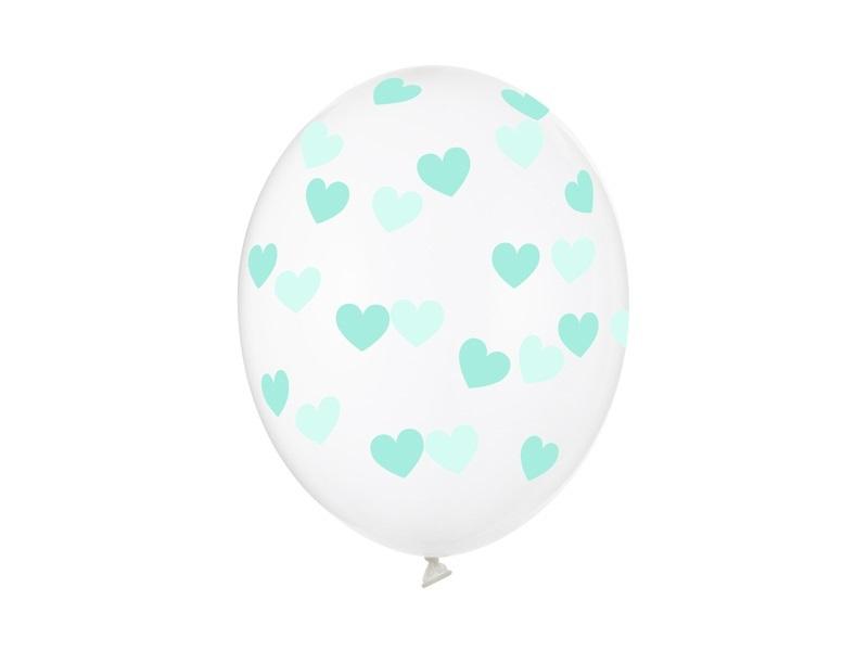 Balony Strong Serduszka w kolorze Crystal Clear, z miętowym pięciostronnym nadrukiem, średnica 30 centymetrów. (1 op. / 50 szt.)