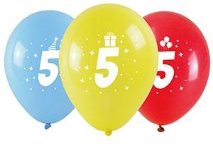 Balony kolorowe wykonane z naturalnego lateksu z obustronnym nadrukiem cyfry. Nadruk wykonany w kolorze białym, kolory balonów: czerwony, żółty i niebieski. W zależności od koloru balonu nadrukowana cyfra posiada dodatkowe atrybuty: imprezową czapeczkę, prezent lub baloniki. Balony wielkości 28 cm. W opakowaniu znajdują się 3 sztuki.