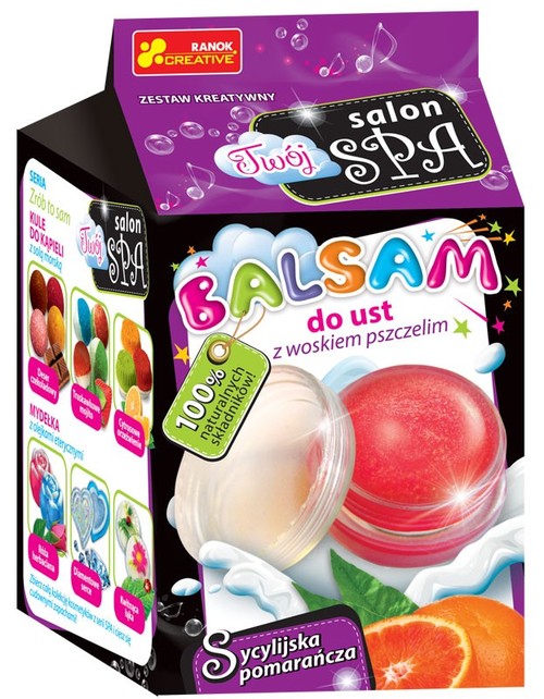 Balsam do ust jest niezastąpionym kosmetykiem. Odżywia, nawilża i nadaje ustom zdrowy wygląd. Idealnie chroni skórę ust przed wysychaniem i pierzchnięciem. Balsam to nie tylko sposób na piękne usta. Może także stanowić wspaniały prezent dla rodziny lub przyjaciół. W zestawie: masło kakaowe, olej, wosk pszczeli, olejek eteryczny - pomarańcza, słoiczek na balsam, plastikowy kubek, plastikowa łyżeczka, drewniany patyczek, barwnik spożywczy, szczegółowa instrukcja.