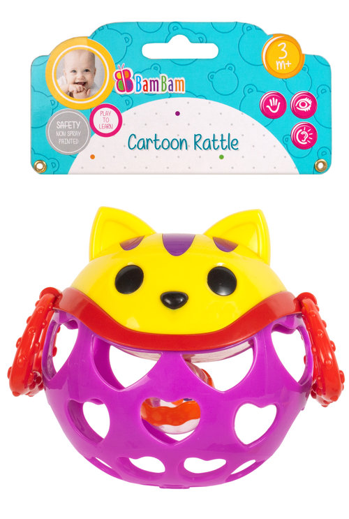 Gumowa GRZECHOTKA KOT z wesołą minką kota, zachęci malucha do energicznej zabawy. Poprzez pchanie, potrząsanie czy turlanie grzechotki dziecko rozwija motorykę i zdolności manualne. Uchwyty z pierścieniami o zróżnicowanej teksturze są doskonałe do nauki chwytania i ćwiczenia zdolności manualnych małych rączek. Umożliwiają ćwiczenie koordynacji i przenoszenia przedmiotu z rączki do rączki. Miekki materiał, z jakiego wykonana jest zabawka, z licznymi otworami ułatwia utrzymanie zabawki w małych rączkach. Chroni przed obtarciami także paluszki jak i wrażliwe dziąsła. Grzechotka stymuluje rozwój słuchu. Zabawka przeznaczona od 3 m-ca.