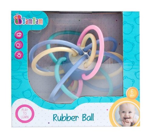 GRZECHOTKA GUMOWA KULA przeznaczona dla niemowląt od 6 M-CA. Kula w pastelowej kolorystyce, o zróżnicowanej fakturze materiałów jak i ciekawym kształcie doskonale dostarcza rozrywki jednocześnie stymulując rozwój zdolności manualnych dziecka oraz rozwój słuchu. Elementy interaktywne w formie pastelowych obręczy zachęcają malucha do zabawy, umożliwiając mu łatwe chwytanie i potrząsanie zabawką, która wydaje wówczas charakterystyczne dźwięki.