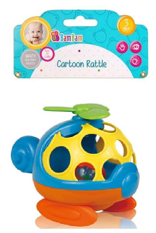MINI HELIKOPTER to niezwykła zabawka- grzechotka dla najmłodszych od 3 m-ca. Obły kształt helikoptera oraz miękki, gumowy dach z licznymi otworami umożliwia łatwe chwytanie zabawki umożliwiając dziecku ćwiczenie zdolności manualnych. Obijąjąca się o wnętrze "kabiny" kula wypełniona kolorowymi, drobnymi kuleczkami potęguje odgłosy dźwiękowe uatrakcyniając zabawę i rozwijąjąc zmysł słuchu. Opcja kręcania śmigłem, wydającym realistyczny dźwięk przy nakręcaniu, absorbuje dziecko na długo stymulując jego wyobraźnię, czego efektem jest odgrywanie roli dzielnego pilota.