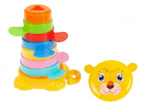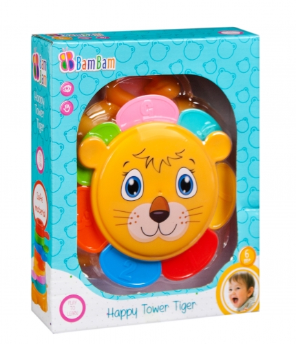 Zestaw kreatywnych  elementów WIEŻY TYGRYS Bam Bam przeznaczony jest dla dzieci od 6 m-ca życia. Siedem elelmentów w intensywnej kolorystyce, oznaczonych cyferkami od 1-7 umożliwia dzieciom łączenie ich na wiele sposobów , w tym na budowanie barwnej wieży zakończonej elementem z figurką radosnego lwa. Każdy z elementów posiada wycięty kształt figury geometrycznej, spełniając funkcję sortera. Doskonale sprawdzają się także jako zabawka do kąpieli, umożliwiając przelewanie wody. Dzięki zabawie kubeczkami maluch uczy się rozpoznawania kształtów, kolorów, posługiwania się przedmiotami i dopasowywania ich od siebie, a także kreatywnego i logicznego myślenia. Rozwija koordynację ruchową oraz zdolności manualne, rozwija wyobraźnię.