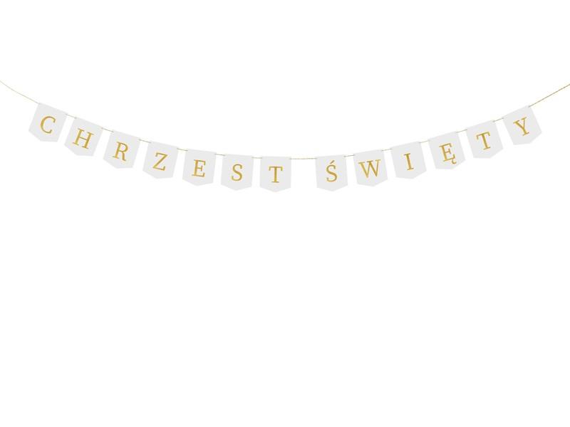 Baner ''Chrzest Święty'' wykonany z papieru w kolorze białym ze złotym napisem oraz sznurek w kolorze złotym o długości ok. 2.5 m. Produkt do samodzielnego złożenia.
