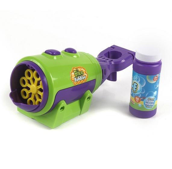 Super maszynka do puszczania baniek, niekończąca się zabawa dla ciebie i twoich przyjaciół. Maszynka wyposażona w specjalny uchwyt, który można zamontować do roweru. Teraz podczas jazdy rower będzie zostawiał za sobą masę kolorowych baniek. Świetna zabawa dla całej rodziny i przyjaciół, W zestawie maszynka puszczająca bańki na baterie oraz płyn do baniek. Maszynka wypuszcza tysiące baniek. Dołączony uchwyt do mocowania do roweru.