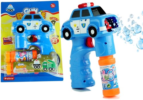 Pistolet na bańki mydlane to zabawka, która spodoba się każdemu dziecku — zarówno chłopcom, jak i dziewczynkom. Zabawa z jego wykorzystaniem umożliwia podziwianie szybujących w powietrzu tęczowych baniek mydlanych, które pięknie mienią się w różnych kolorach. Pistolet ten posiada wiele zalet: umila zabawę dźwiękami przypominającymi syrenę policyjną, a ponadto w czasie, w którym człowiek przy użyciu klasycznego zestawu jest w stanie zrobić tylko jedną bańkę, pistolet ten może zrobić ich dziesiątki. Policyjny zestaw do robienia baniek mydlanych składa się z: - pistoletu, - 2 sztuk zapasowych płynów. Konstrukcja prezentowanej zabawki łączy w sobie budowę charakterystyczną dla pistoletów ze wzornictwem związanym z Policją. Jak widać, fantastycznie łączy się to w całość, zmieniając zwykłą maszynkę do robienia baniek mydlanych w oryginalną, niespotykaną zabawkę. Dużym atutem są efekty specjalne w postaci dźwięków przypominających syrenę policyjną, załączające się po wciśnięciu spustu. Obsługa zabawkowego pistoletu jest bardzo prosta, przedstawiono ją w obrazkowy sposób w tylnej części opakowania. Wystarczy odkręcić zakrętkę buteleczki z płynem, usunąć zabezpieczenie i wkręcić do pistoletu. Po każdorazowym naciśnięciu spustu z pistoletu zaczną wydostawać się przepiękne, kolorowe bańki mydlane. Po zakończonej zabawie należy odkręcić buteleczkę z płynem i odłożyć ją w bezpieczne miejsce. Innowacyjna formuła płynu sprawia, że jego skład jest bezpieczny i nietoksyczny, a bańki są niezwykle wytrzymałe i trwałe. Warto jednak pamiętać, by co jakiś czas czyścić pistolet. By to zrobić, należy odkręcić buteleczkę z płynem i przetrzeć maszynkę mokrą szmatką. Zabieg ten sprawi, że zabawkowy pistolet posłuży dziecku przez dłuższy czas, gwarantując mu fantastyczną zabawę. Zabawkowy pistolet do baniek mydlanych przeznaczony jest dla wszystkich dzieci powyżej 3. roku życia. Zasilany jest on 3 sztukami baterii AA 1,5V, które nie zostały dołączone do zestawu, jednak ich brak nie uniemożliwia zabawy. Pistolet na bańki posiada certyfikat CE, a jego produkcja jest zgodna z normą EN 71, co gwarantuje bezpieczeństwo płynące z użytkowania. Policyjny pistolet został zapakowany w blister, dzięki czemu wygląda bardzo estetycznie. Wymiary elementów zestawu: - pistolet: 18 cm x 12,5 cm x 5,5 cm, - zapas: 9 cm x 3,5 cm. Wymiary opakowania: - 25, 5 cm x 18 cm x 5,5 cm.