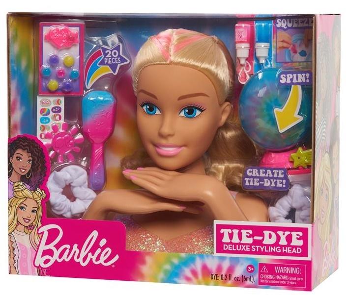 Zestaw Deluxe zawiera głowę Barbie do stylizacji, spinner do artystycznego farbowania gumek i wstążek, różowy barwnik, niebieski barwnik, dwie gumki do włosów, wstążkę, kolorową szczotkę do włosów, dwie spinki, które można samodzielnie ozdobić, osiem klejnocików, kółko ze sztucznymi paznokciami oraz naklejki do zdobienia paznokci.