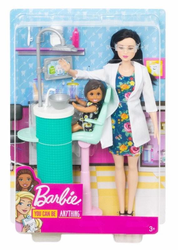 Odkryj świat medycyny razem z Barbie i medycznymi zestawami do zabawy! Barbie jest gotowa do konsultacji w stylowym gabinecie wyposażonym w akcesoria potrzebne do przeprowadzenia badania i zaopiekowania się jej pacjentami. Do wyboru ciekawe specjalizacje: weterynarz w zoo, lekarz dziecięcy lub dentystka. Kolorowe akcenty i detale inspirowane gabinetem lekarskim dodają zabawie realizmu. Tematycznie dobrane stroje to idealne połączenie profesjonalizmu i charakterystycznego stylu Barbie. Barbie Dentystka posiada w gabinecie prawdziwy fotel dentystyczny i unit stomatologiczny (z kranikiem, półkami i lampą), dzięki którym może zatroszczyć się o swojego małego pacjenta. Barbie Lekarz dziecięcy wykonuje podwójną pracę w swoim gabinecie wyposażonym między innymi w dwie wanienki i może zatroszczyć się aż o DWOJE dzieci. Barbie Weterynarz w zoo dogląda chorych zwierzątek uroczej małpki i tygryska przy stole do badań wyposażonym w wagę, posłanie dla zwierzątka i półkę. Urocze akcesoria dodatkowo zachęcają do zabawy. Wyszczotkuj zęby, nakarm dzieci lub sprawdź wagę zwierzątek. Młode lekarki z radością zatroszczą się o zdrowie swoich pacjentów razem z Barbie. Nie ograniczaj się tylko do jednej roli, bo z Barbie możesz być kim chcesz! Zawiera lalkę Barbie w ubranku pasującym jej do zawodu, akcesoria, a także wyposażenie gabinetu, tematycznie dopasowane elementy i lalkę pacjenta (lub lalki pacjentów).