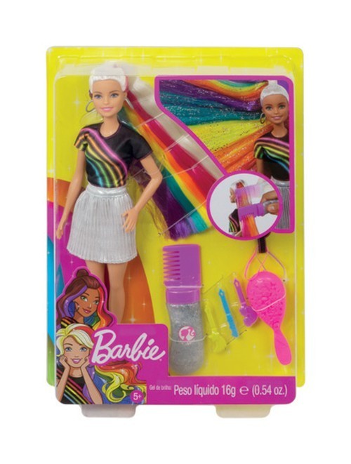 Młode stylistki mogą tworzyć kolorowe błyszczące fryzury Barbie® dzięki temu wyjątkowemu zestawowi z akcesoriami do stylizacji włosów lalki. Czas na trochę blasku! Lalka Barbie® ma wspaniałe tęczowe włosy, które można ozdabiać za pomocą specjalnego grzebienia z brokatem. Jej fryzura naprawdę przepięknie się mieni! Szczotka, spinki oraz gumki do włosów pozwalają na precyzyjne dopracowanie fryzury, dzięki czemu Barbie będzie gotowa na każdą okazję. Lalka ubrana jest w pasującą czarną koszulkę z motywem tęczy, srebrną spódniczkę oraz czarne buty. Twórz fryzury, ozdabiaj, zmieniaj i baw się od nowa – z Barbie możesz być kim chcesz! W zestawie lalka Barbie w ubrankach, grzebień z brokatem, szczotka, trzy spinki i dwie gumki do włosów. Lalka nie stoi samodzielnie. Kolory i elementy dekoracyjne mogą się różnić. Dla dzieci w wieku od 5 lat