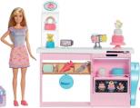 Lalka Barbie® pomoże dzieciom zrobić „ciasto” i udekorować je za pomocą wyjątkowych akcesoriów do wypieków! Ten kreatywny zestaw to idealny przepis na zabawę – zawiera trzy pojemniki z masą plastyczną w kolorze różowym, niebieskim oraz białym z dodatkiem konfetti, dzięki której można tworzyć własne „pyszności”. Wyspa kuchenna jest podzielona na trzy części, w których dzieci mogą „piec”, dekorować i prezentować swoje ciasta. Jest tam również miejsce na ponad 10 akcesoriów dołączonych do zestawu. W zestawie lalka cukiernik Barbie® w modnym stroju, wyspa kuchenna z „piekarnikiem”, w którym „wyrasta” ciasto, witrynka, trzy pojemniki z masą plastyczną Barbie®, narzędzie do dekorowania ciast z trzema szablonami, trzy ozdoby do ciast, podstawka, rękaw cukierniczy, kasa, łopatka, talerzyk, sztućce i pudełko na ciasto. Lalka nie stoi samodzielnie. Dla dzieci w wieku od 4 lat