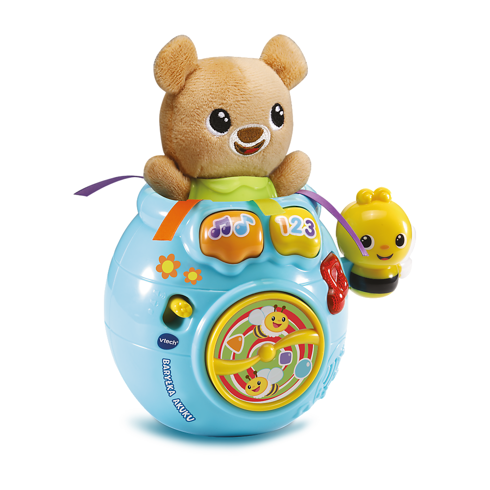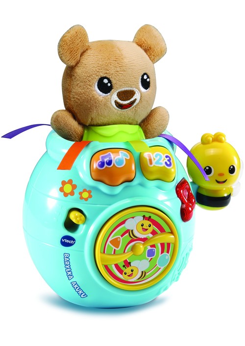 Poznaj pierwsze słowa z Baryłką Akuku od firmy VTech! Wystarczy nacisnąć jeden z dwóch przycisków na Baryłce, aby rozpocząć wspaniałą zabawę z mięciutkim Misiem. Ta zabawka wspomaga rozwój umiejętności językowych, sensorycznych, motorycznych oraz intelektualnych. Zabawka VTech charakteryzuje się ponad 50 różnymi zwrotami, piosenkami, dźwiękami i melodiami. Ponadto, posiada przyciski, które uczą nazw pierwszych słów i cyfr, oraz oferuje 4 piosenki i 15 melodyjek, które zapewniają dodatkową frajdę podczas zabawy. Dla dzieci w wieku od 6 miesięcy