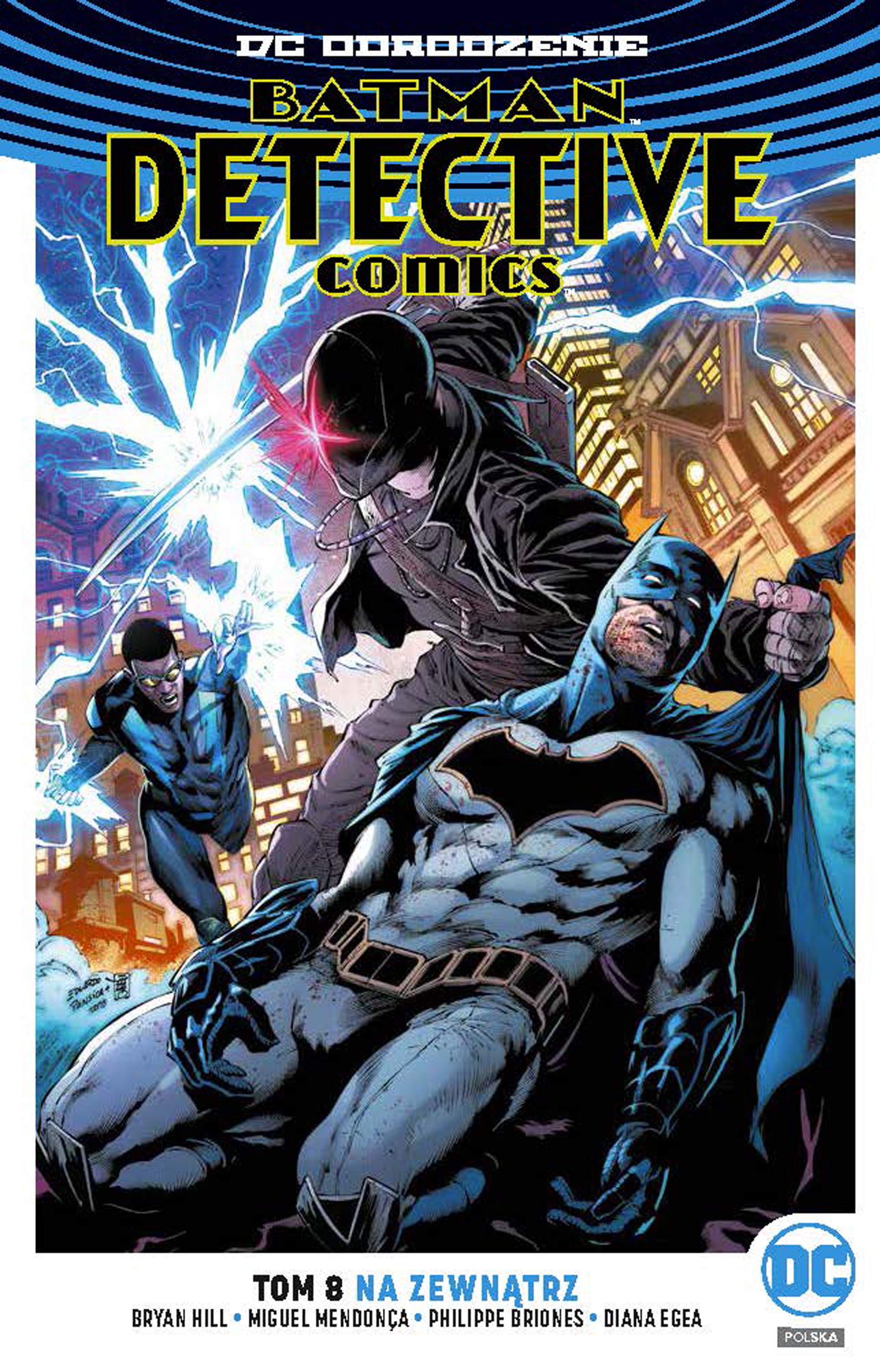 Kolejny tom serii Batman Detective Comics w ramach linii wydawniczej DC Odrodzenie. Najlepsza drużyna superbohaterów, jaka kiedykolwiek działała w Gotham City... przestała istnieć na dobre. Batman, Batwoman, Red Robin, Orphan, Azrael, Batwing i wszyscy ich sojusznicy walczyli o ocalenie miasta przed zniszczeniem przez potwora, którego sami pomogli stworzyć. Teraz drużyna Mrocznych Rycerzy rozwiązuje się, aby poradzić sobie z konsekwencjami swoich czynów. Jednak dla młodych bohaterów, takich jak Cassandra Cain i Duke Thomas, bitwa może się skończyć, ale wojna dopiero się zaczyna. Nie chcą rezygnować z walki z przestępcami, nawet jeśli będą musieli wykonywać rozkazy kogoś innego niż Batman. Czarna Błyskawica wręcz narodził się do tej roli. Nawet Batman zgadza się, że Jefferson Pierce, nauczyciel, który stał się superbohaterem, jest idealnym kandydatem do roli przywódcy kolejnej drużyny. Jednak Czarna Błyskawica i Mroczny Rycerz bardzo się różnią. Ich sposoby działania mogą doprowadzić do tego, że ich podopieczni zaczną walczyć ze sobą nawzajem. Czy Gotham City jest wystarczająco duże dla nich obu? Przekonacie się w ósmym tomie Detective Comics – Na zewnątrz napisanym przez Bryana Hilla (Postal), a narysowanym przez Miguela Mendonçę, Philippe’a Brionesa i Dianę Egeę.
