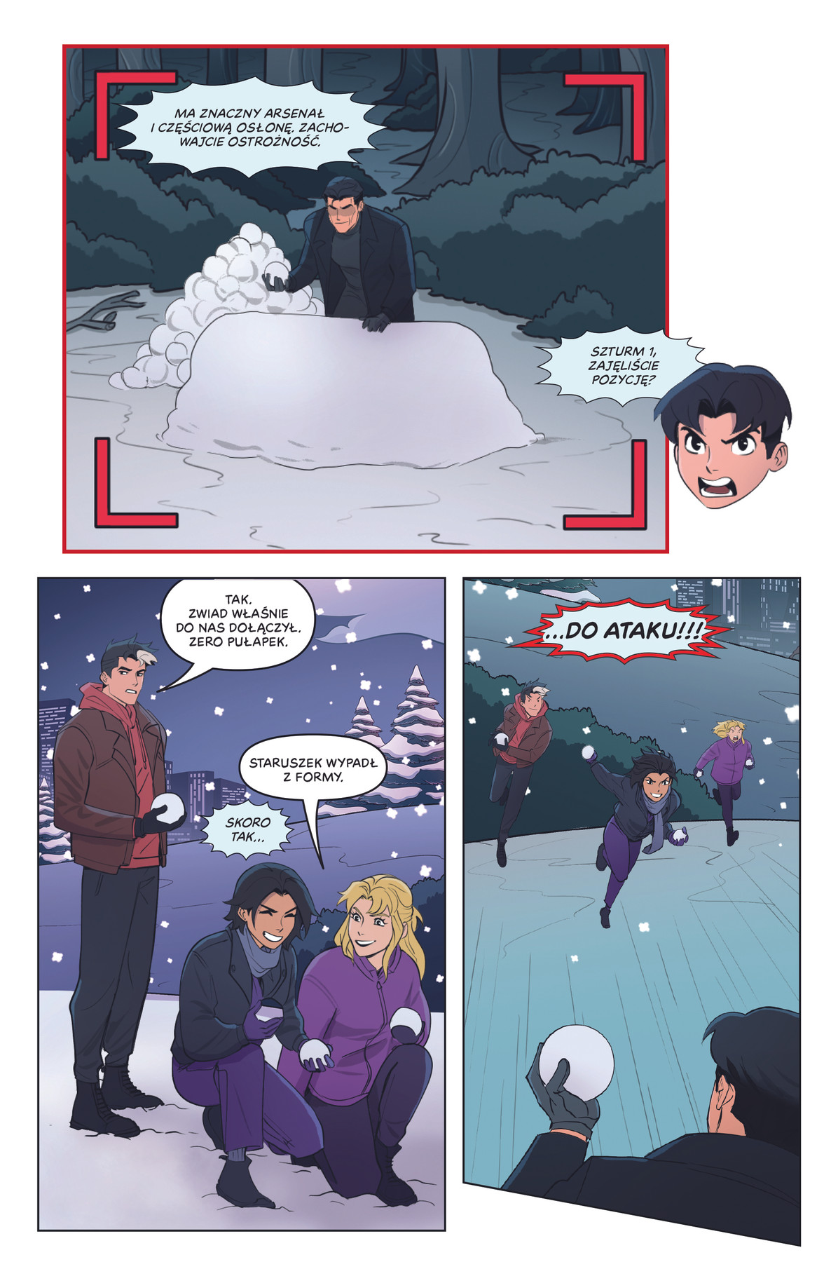 Bruce Wayne i Alfred Pennyworth są doskonałymi opiekunami – zawsze gotowi wysłuchać zmartwionych bliskich, dostarczyć deser do szkoły czy dzielić się wiedzą na temat strategii. Zazwyczaj jednak dyżurują przy komunikatorze, by upewnić się, że każdy wróci bezpiecznie do domu. Pierwszy śnieg w roku to jednak wyjątkowa okazja, by zaprezentować na żywo swoje umiejętności. Zwłaszcza że Batman i Alfred ruszają do ataku! A kiedy śnieg stopnieje, wracamy do zwykłych spraw pogromców zbrodni: szpanowania gadżetami, podkradania się do rodzeństwa, wzywania brata na ratunek czy wymyślania najwygodniejszej pozycji na plecach sprintera.