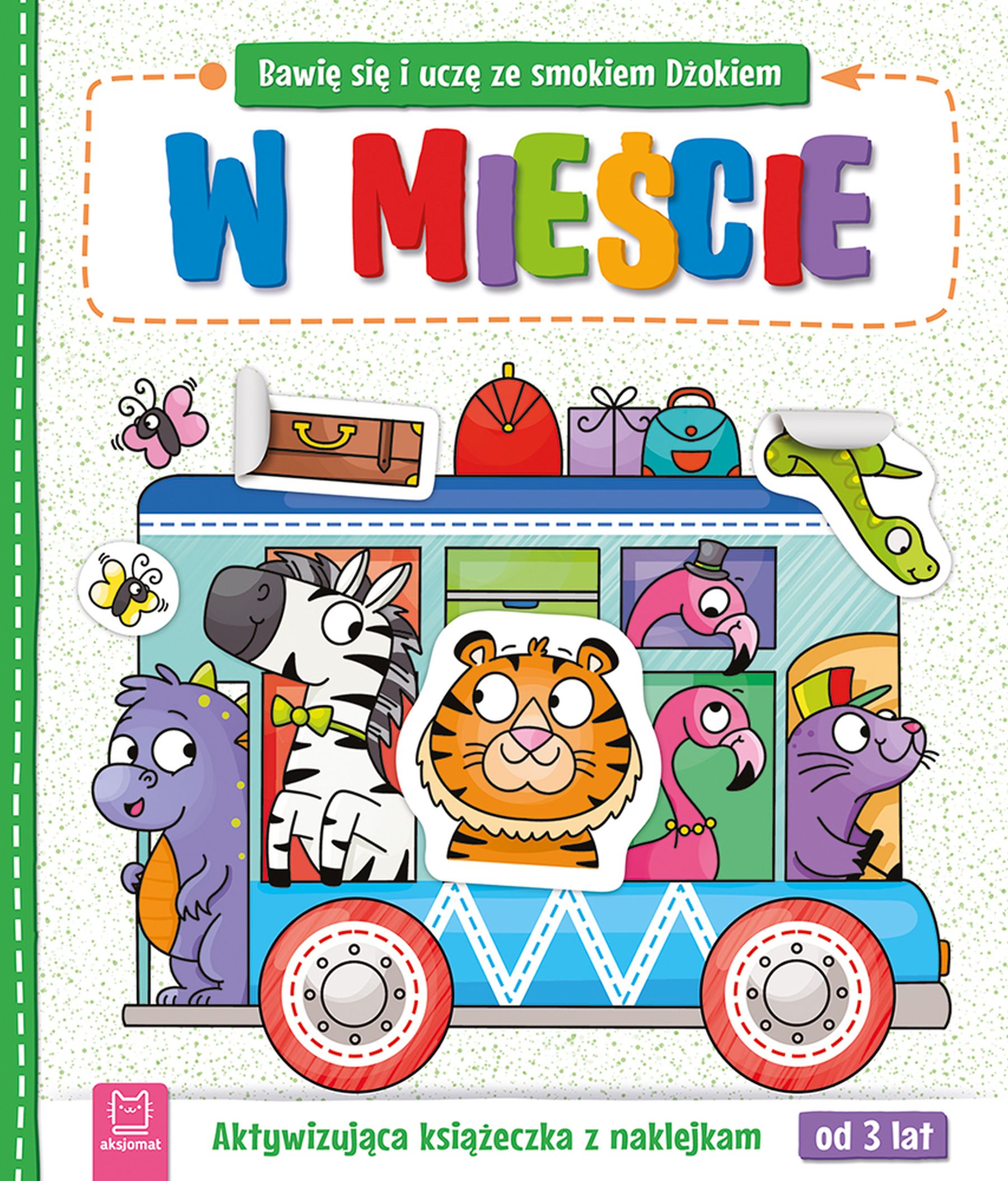 Okładka książki Bawię się i uczę ze smokiem Dżokiem. W mieście. Aktywizująca książeczka z naklejkami od 3 lat