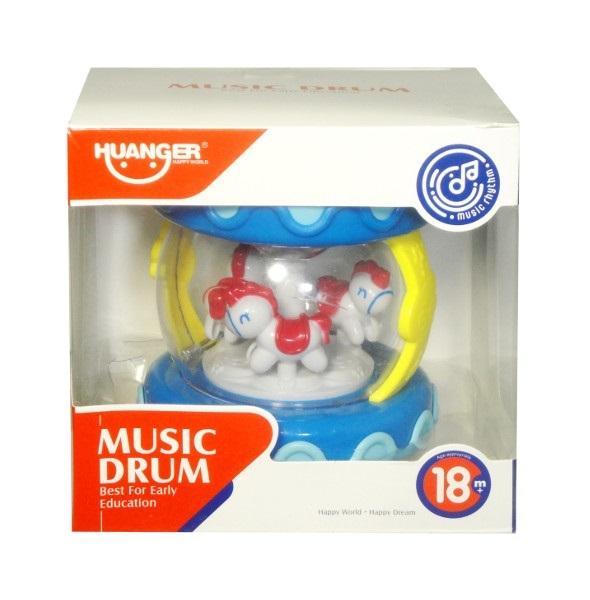 Zabawka bębenek z pozytywką. Bębenek wydaje różne dźwięki, świeci światełkiem, gra melodie, a jednorożce znajdujące się wewnatrz poruszają się. Zabawka działa na baterie typu AAA. Baterie nie są załączone do zabawki. Produkt zapakowany w kartonowe opakowanie z przezroczystym okienkiem. Zabawka dla dzieci od 18 miesiąca życia. Podane wymiary są wymiarami opakowania.
