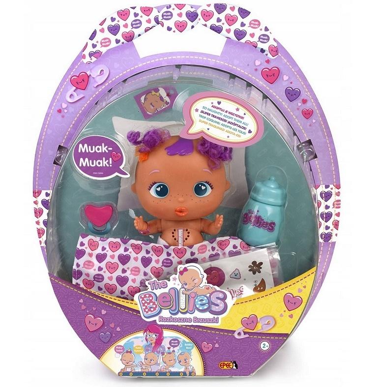 Każda Bellies ma własną butelkę dla niemowląt, smoczek i spersonalizowany koc. Kiedy zdejmujesz plasterek z jej pępka, usłyszysz bicie małego serduszka, a Bellies natychmiast zaczynie gaworzyć. Każda z lalek robi to w inny i super zabawny sposób. Zabawa "" rozkosznymi brzuszkami"" jest pełna niespodzianek: zdejmij pieluchę, a odkryjesz charakterystyczne znamię swojej Bellies: może to być gwiazdka lub serduszko, donat albo duszek. Ale to nie wszystko - jest jeszcze kolejna atrakcja, pieluszka skrywa zabawną niespodziankę.
