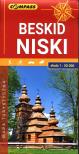 Beskid Niski to najniższe pasmo górskie w całych Karpatach ? maksymalne wysokości wynoszą ok. 1'000 m n.p.m. Najwyższy szczyt po stronie polskiej to Lackowa (997 m n.p.m.). Są to najdziksze i najmniej zagospodarowane turystycznie polskie góry, które w niewielkim stopniu zostały zmienione przez człowieka. Niepowtarzalne walory krajobrazowe wielu opuszczonych i nadal niezaludnionych miejsc ze śladami dawnych wsi i dziewiczą przyrodą górską, dość liczne pamiątki po mieszkańcach tych ziem (Łemkach) w postaci pięknych drewnianych cerkwi, są dodatkowym powodem, dla którego warto tu przyjechać. Jest to wymarzone miejsce na wyprawy rowerowe. Niewiele tu uciążliwych podjazdów, za to mnóstwo długich, łagodnie wznoszących się i zupełnie bezludnych dolin. Na mapie zastosowano cieniowanie w celu uzyskania wrażenia plastyczności rzeźby terenu. Mapa polecana jest do uprawiania różnych form turystyki, jak również dla osób zmotoryzowanych.