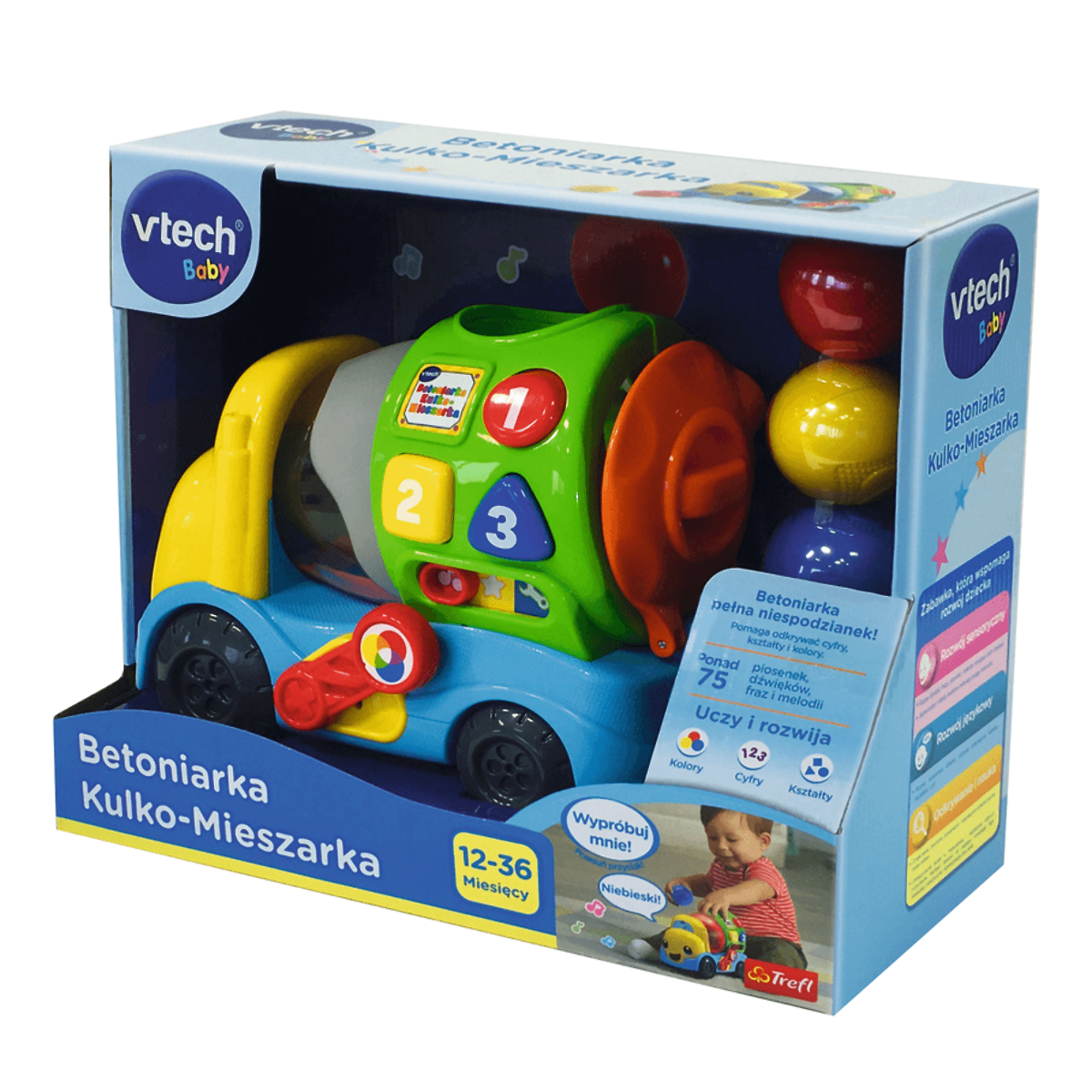 Betoniarka Kulko-Mieszarka, to interaktywna zabawkowa ciężarówka, która z pewnością przysłuży się do rozwoju malucha. Dzięki zabawie Betoniarką Kulko-Mieszarką, Twoje dziecko może dokonać wielu odkryć! Naciskając przyciski lub wrzucając kuleczki do mieszalnika, dziecko uczy się kolorów, cyfr i kształtów. Po naciśnięciu dźwigni mieszalnika, kolory znajdujące się w skrzyni są mieszane i otrzymywany jest nowy kolor! Różne kolory poznasz wnet, wrzuć kulki do mieszalnika, zaskoczę Cię! Funkcje zabawki: czas na mieszanie kolorów - włóż kulki do mieszalnika, a następnie naciśnij dźwignię, aby utworzyć nowe kolory trzy przyciski kształtów uczę cyfr, kształtów i kolorów trzy warianty zabawy - wybierz zabawę pomiędzy trybami: muzyka, odkrywanie, nauka nauka cyfr - betoniarka rozpoznaje cyfrę zapisaną na kulce wrzuconej do mieszalnika otwierane tylne drzwi pozwalające na łatwe usunięcie kulek z mieszalnika Zabawka w polskiej wersji językowej.