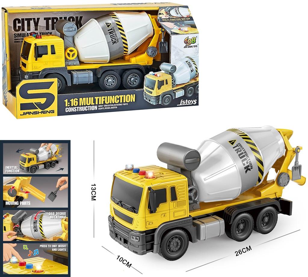 Plastikowe auto betoniarka. Autko na dachu szoferki posiada kilka przycisków, po naciśnięciu których auto wydaje dźwięki samochodu oraz świeci światłami.