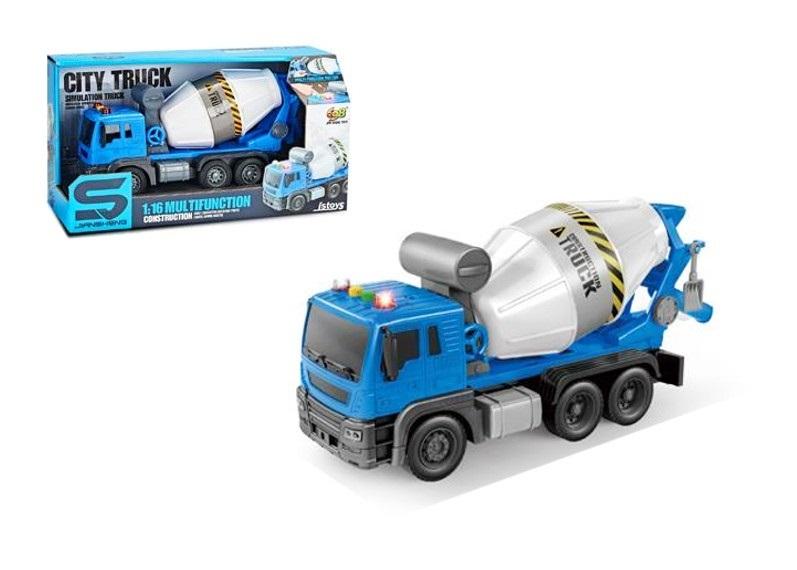 Ciężarówka betoniarka z ruchomymi częściami. Zabawka świeci kolorowymi światełkami i wydaje dźwięki m.in. klaksonu, cofania,sereny alarmowej Zabawka działa na baterie typu AG13. Baterie znajdują się w zabawce. Produkt zapakowany w kartonowe opakowanie z okienkiem. Zabawka przeznaczona dla dzieci od 3 lat. Podane wymiary są wymiarami opakowania.