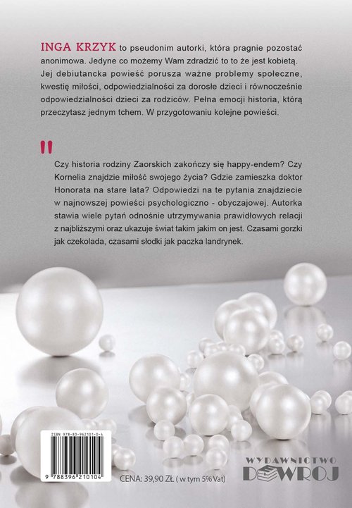 Debiutancka powieść Ingi Krzyk porusza ważne problemy społeczne, kwestię miłości, odpowiedzialności za dorosłe dzieci i równocześnie  odpowiedzialności dzieci za rodziców. Pełna emocji historia, którą przeczytasz jednym tchem. Czy historia rodziny Zaorskich zakończy się happy-endem? Czy Kornelia znajdzie miłość swojego życia? Gdzie zamieszka doktor Honorata na stare lata? Odpowiedzi na te pytania znajdziecie w najnowszej powieści psychologiczno - obyczajowej. Autorka stawia wiele pytań odnośnie utrzymywania prawidłowych relacji z najbliższymi oraz ukazuje świat takim jakim on jest. Czasami gorzki jak czekolada, czasami słodki jak paczka landrynek.